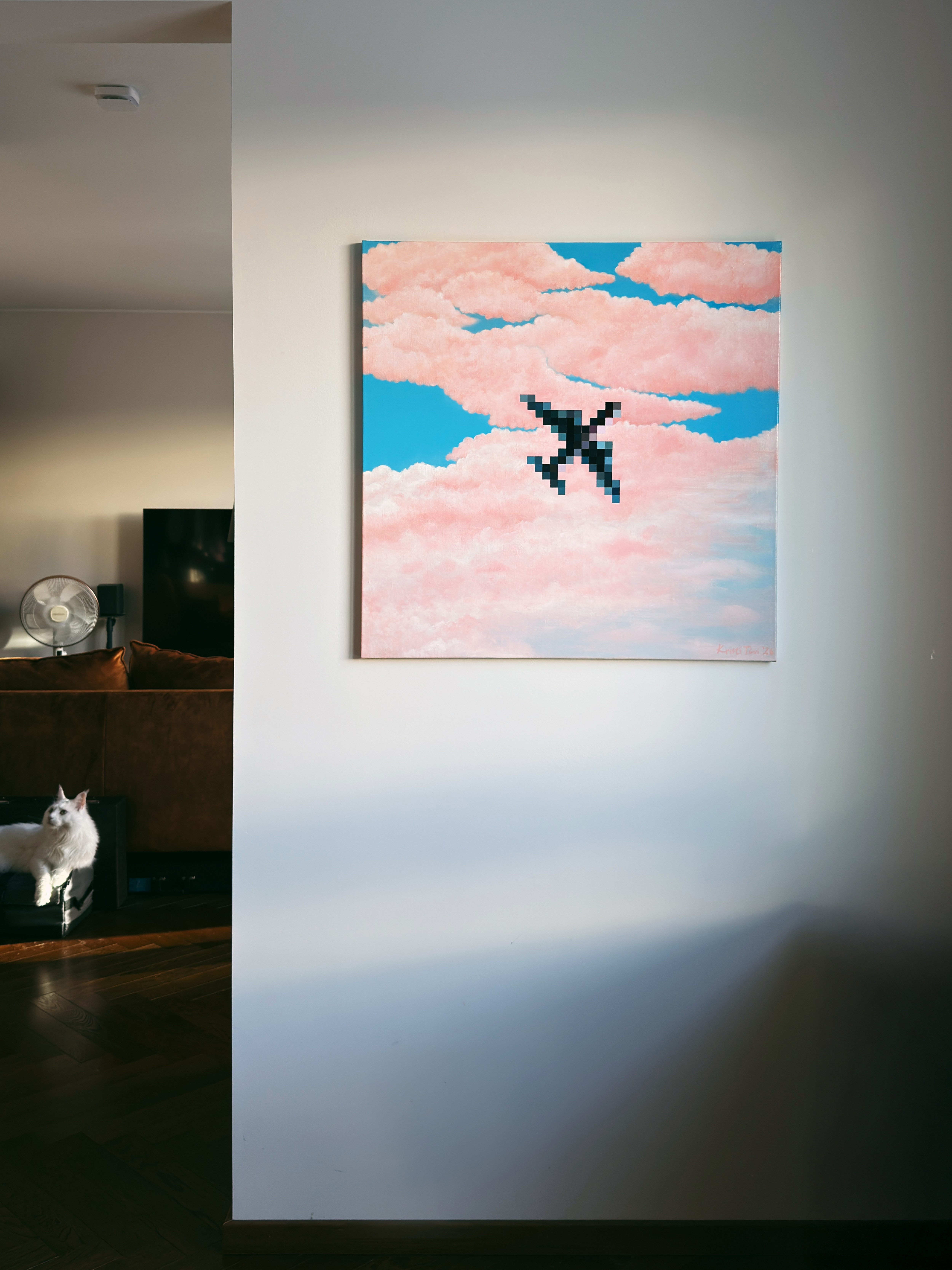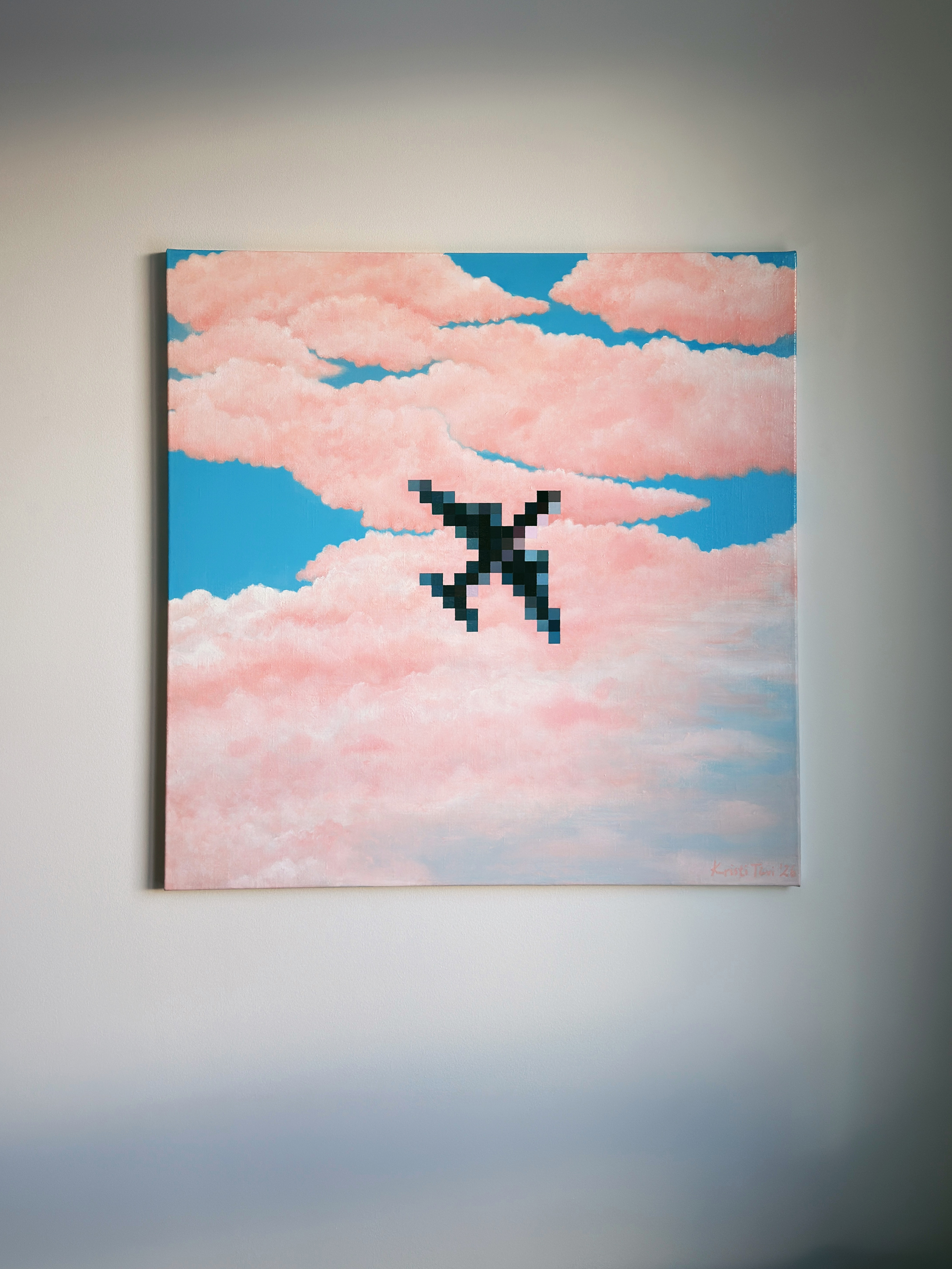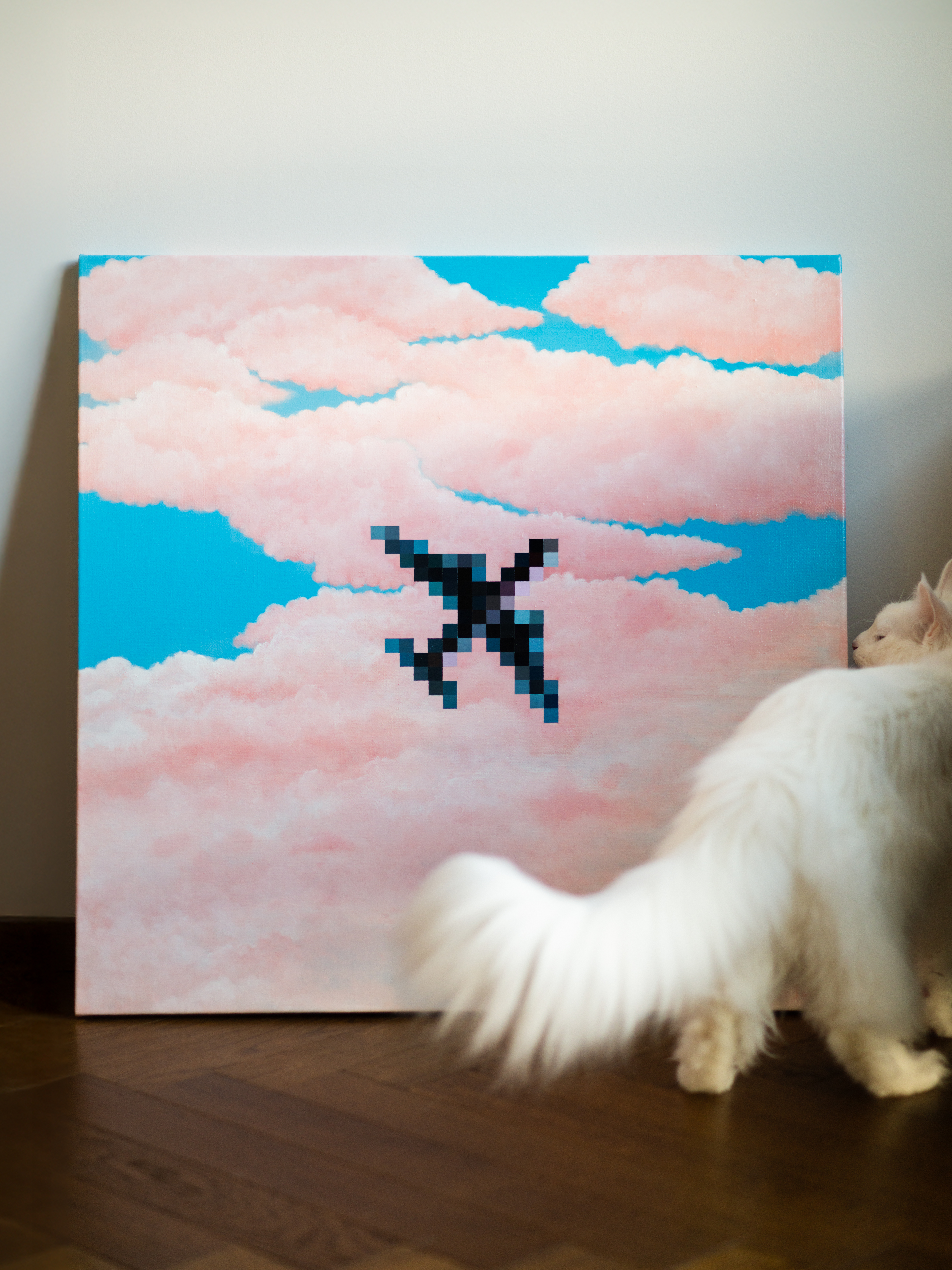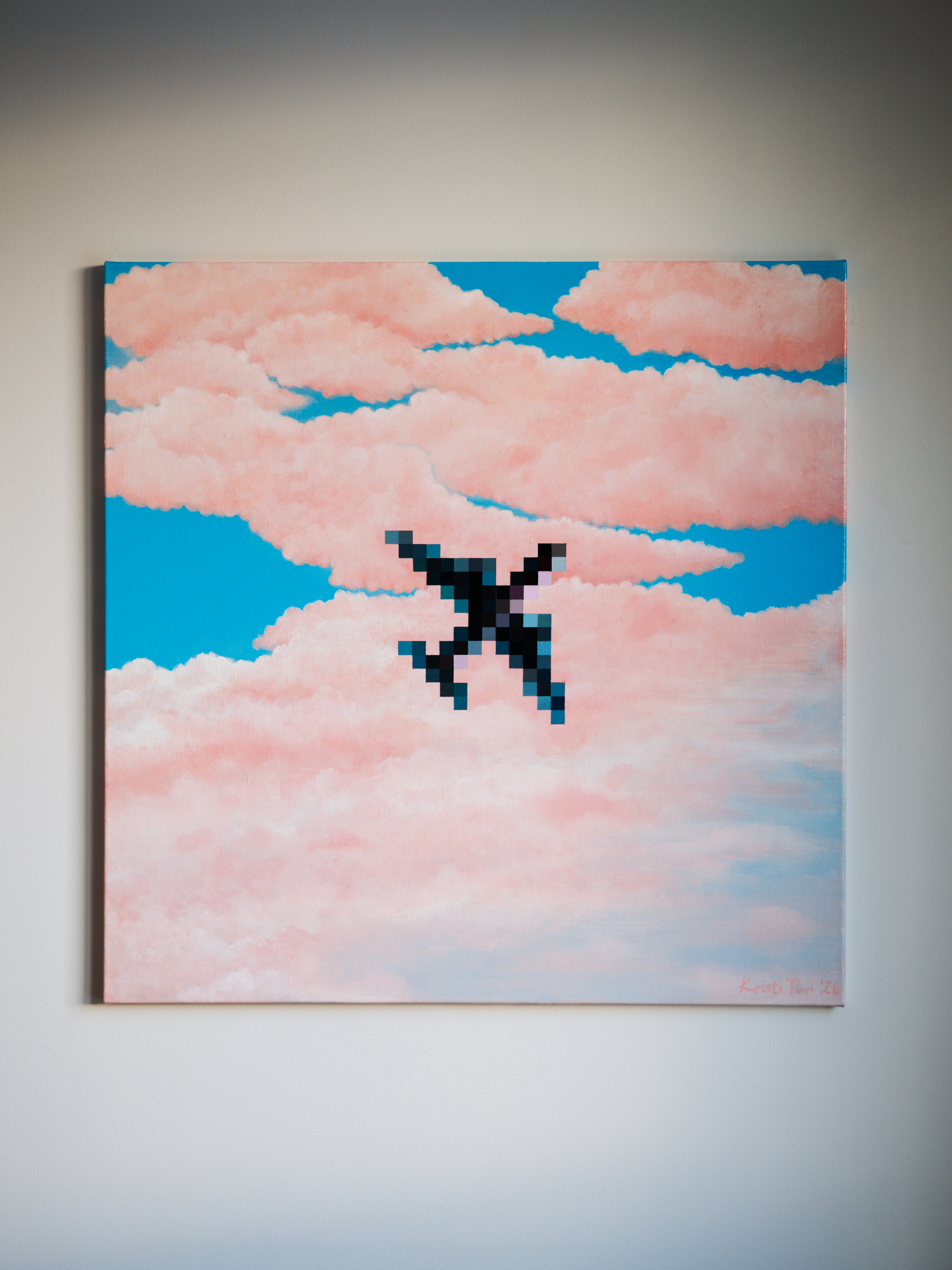 “High” is an acrylic painting on linen canvas that holds a simple paradox: the airplane feels close enough to be truly seen, yet remains too distant to be clear. when it passes overhead, it lasts only for a moment, like a quick, blurred image that disappears within seconds into drifting clouds. it is a harmony of stillness and fleetingness.