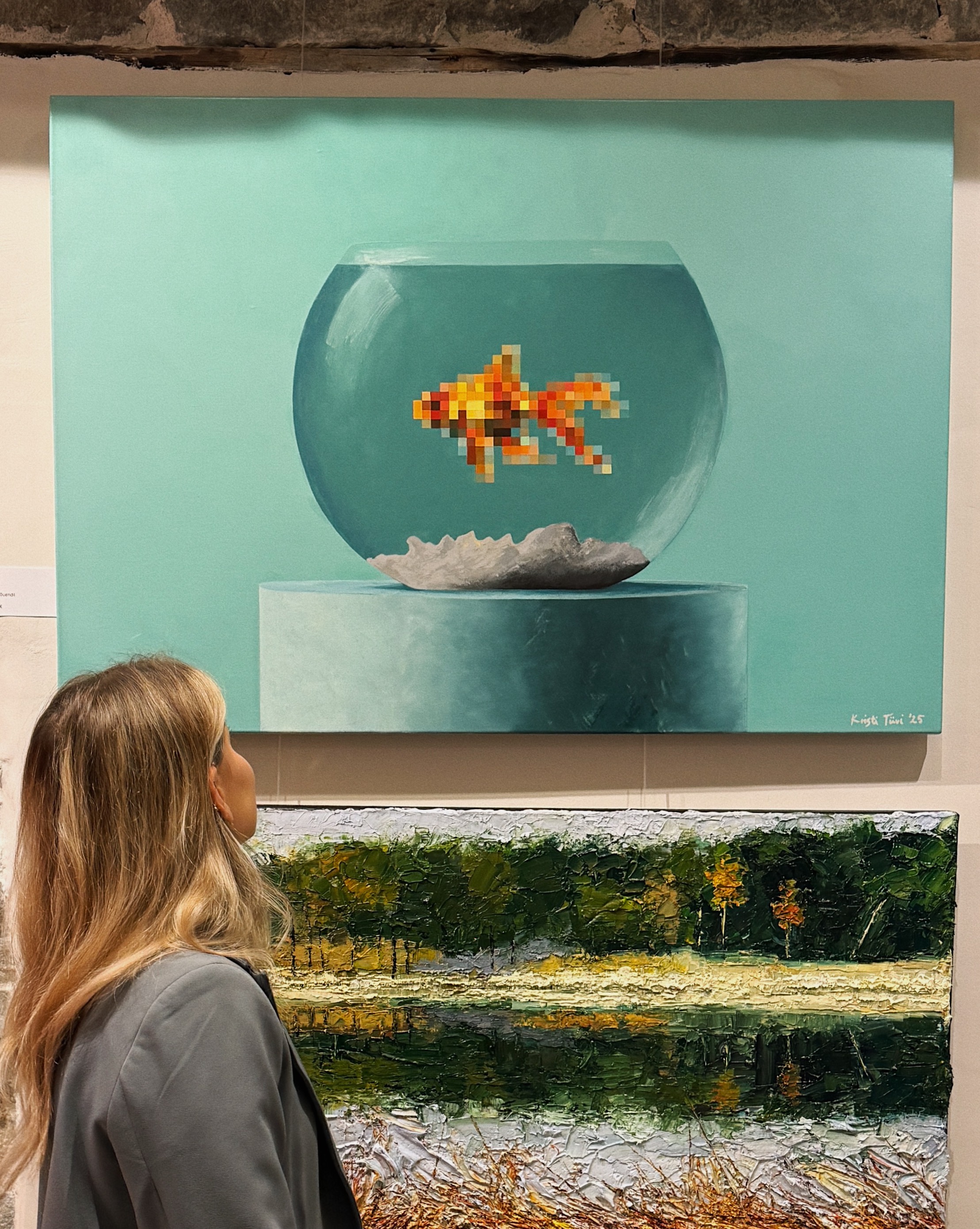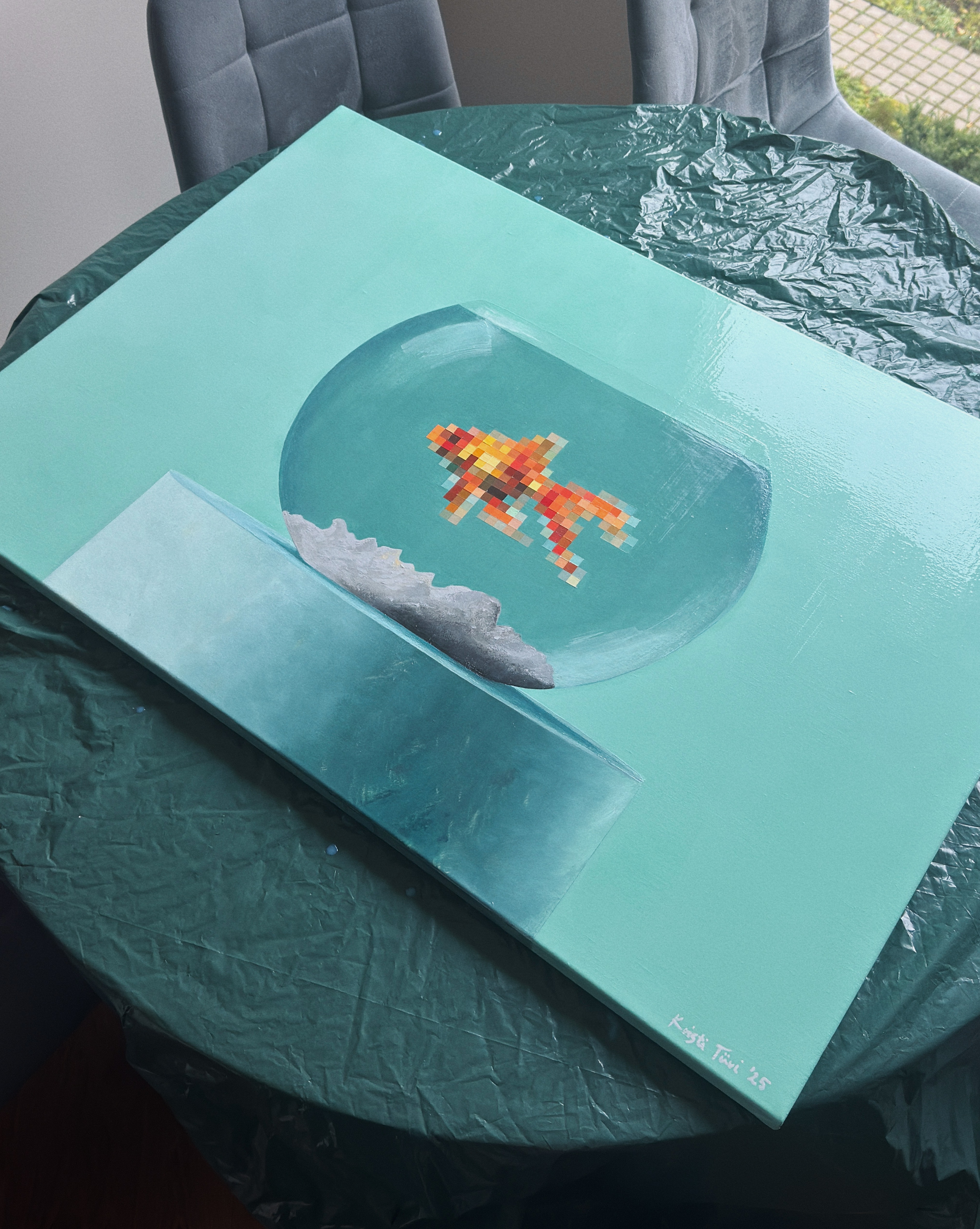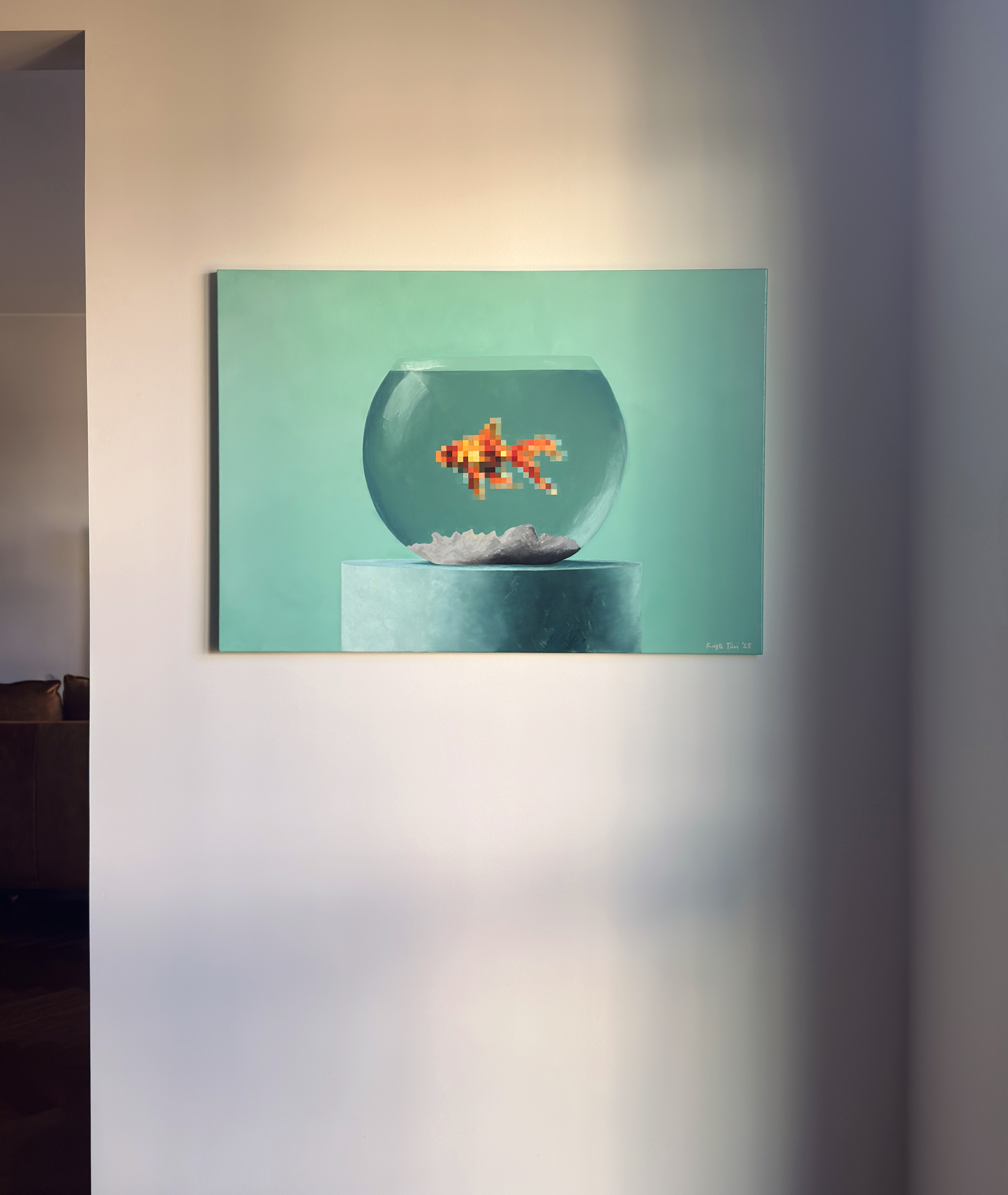 In Glichfish, the fish embodies memories: the past moments in our minds that are kept in our heads, like fragile bowls, which time distorts, slowly turning them hazy like pixels.